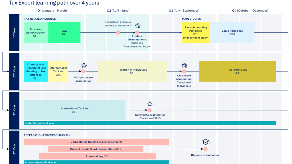 The program for the Swiss Certified Tax Expert diploma is modular, allowing for a personalized study plan that can be completed over 2 to 4 years. It is designed to be undertaken part-time, alongside your professional career.