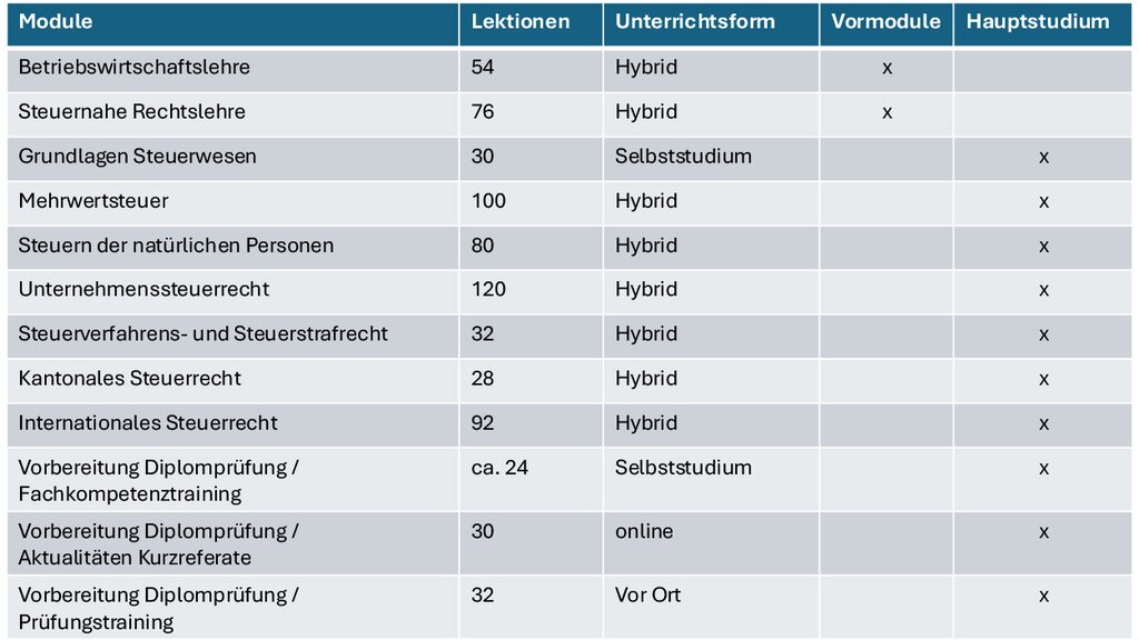 Das Studium zur Diplomierten Steuerexpertin oder zum Diplomierten Steuerexperten ist modular aufgebaut und lässt sich individuell über 2–4 Jahre absolvieren – berufsbegleitend und praxisnah. Insgesamt umfasst das Studium 698 Lektionen (à 45 Minuten), davon etwa 200 Lektionen asynchron, also zeit- und ortsunabhängig.