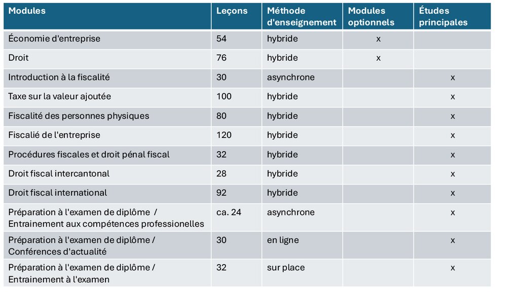 3 modules supplémentaires préparent de manière ciblée à l’examen de diplôme: formation à la compétence professionnelle, entraînement aux examens et un module sur l’actualité fiscale. Cette phase sert à approfondir et à mettre en pratique les connaissances acquises.