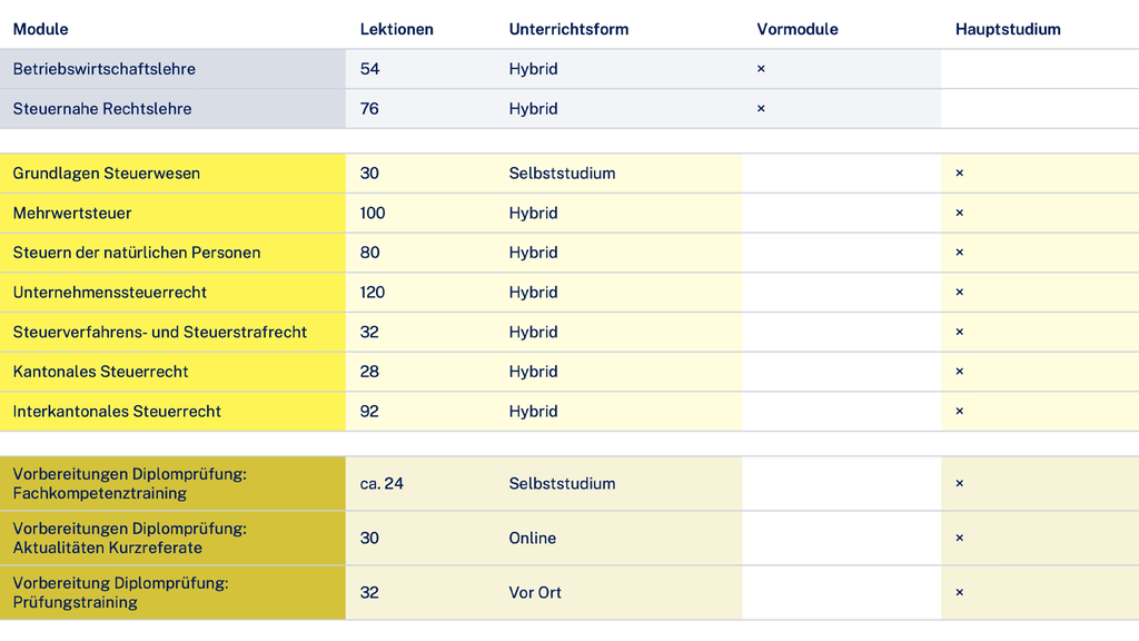 Das Studium zur Diplomierten Steuerexpertin oder zum Diplomierten Steuerexperten ist modular aufgebaut und lässt sich individuell über 2–4 Jahre absolvieren – berufsbegleitend und praxisnah. Insgesamt umfasst das Studium 698 Lektionen (à 45 Minuten), davon etwa 200 Lektionen asynchron, also zeit- und ortsunabhängig.